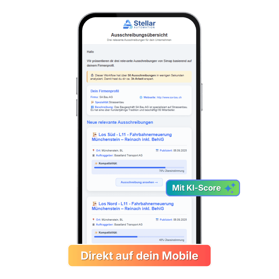 Du erhältst 3 passende Ausschreibungen mit unserem KI-Scoring auf Basis von deinem Unternehmen.